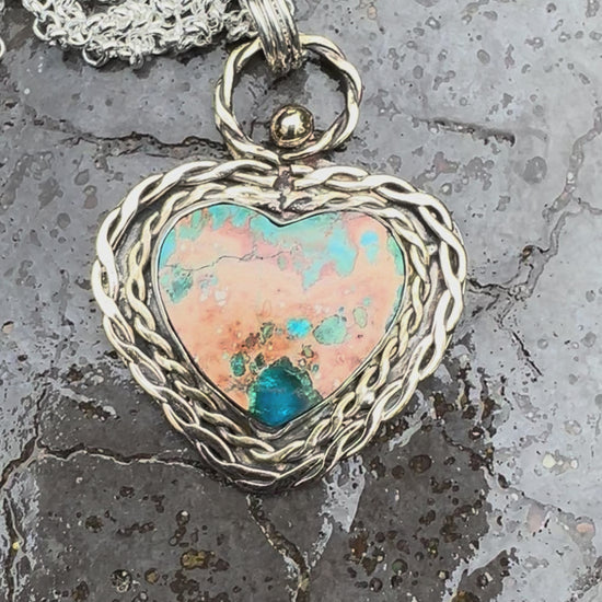 This handcrafted necklace features a heart-shaped sediment stone with earthy swirls of turquoise, beige, and brown. Wrapped in red brass twisted wire and suspended from a sterling silver chain, the pendant evokes grounded elegance and emotional depth. The back is hand-stamped with hearts, and the piece is finished with my maker’s mark—a dog with a heart—symbolizing loyalty, love, and quiet companionship.
